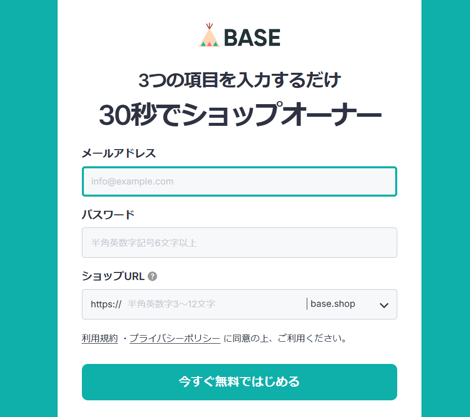 BASE公式サイトにいくと「無料ではじめる」というボタンがあるのでクリックします。