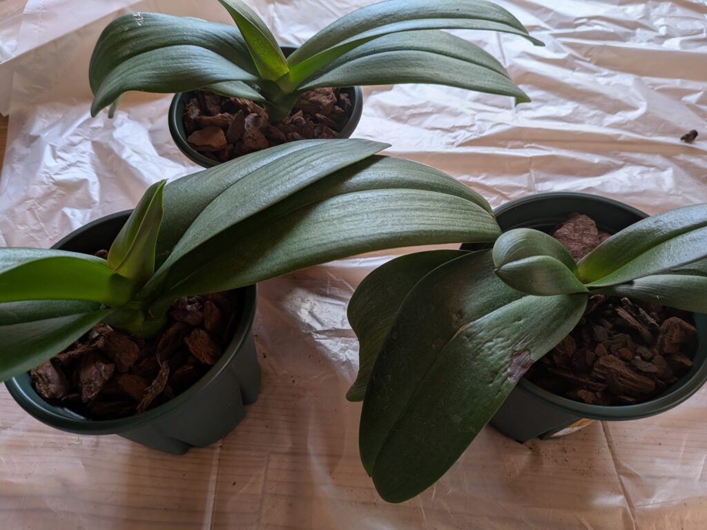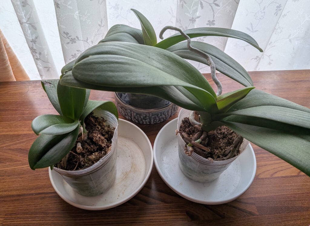 根腐れから回復途中の3株と、譲り受けた花終わりの3株の胡蝶蘭を育成している、園芸初心者のみちゃよです。