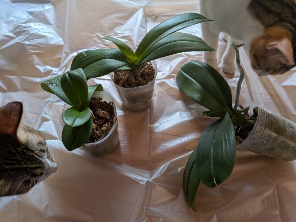 一見元気で順調そうに見えるのですが、特に左下の胡蝶蘭は、葉が成長せず弱々しく、水苔が少しカビ臭いような状態でした。