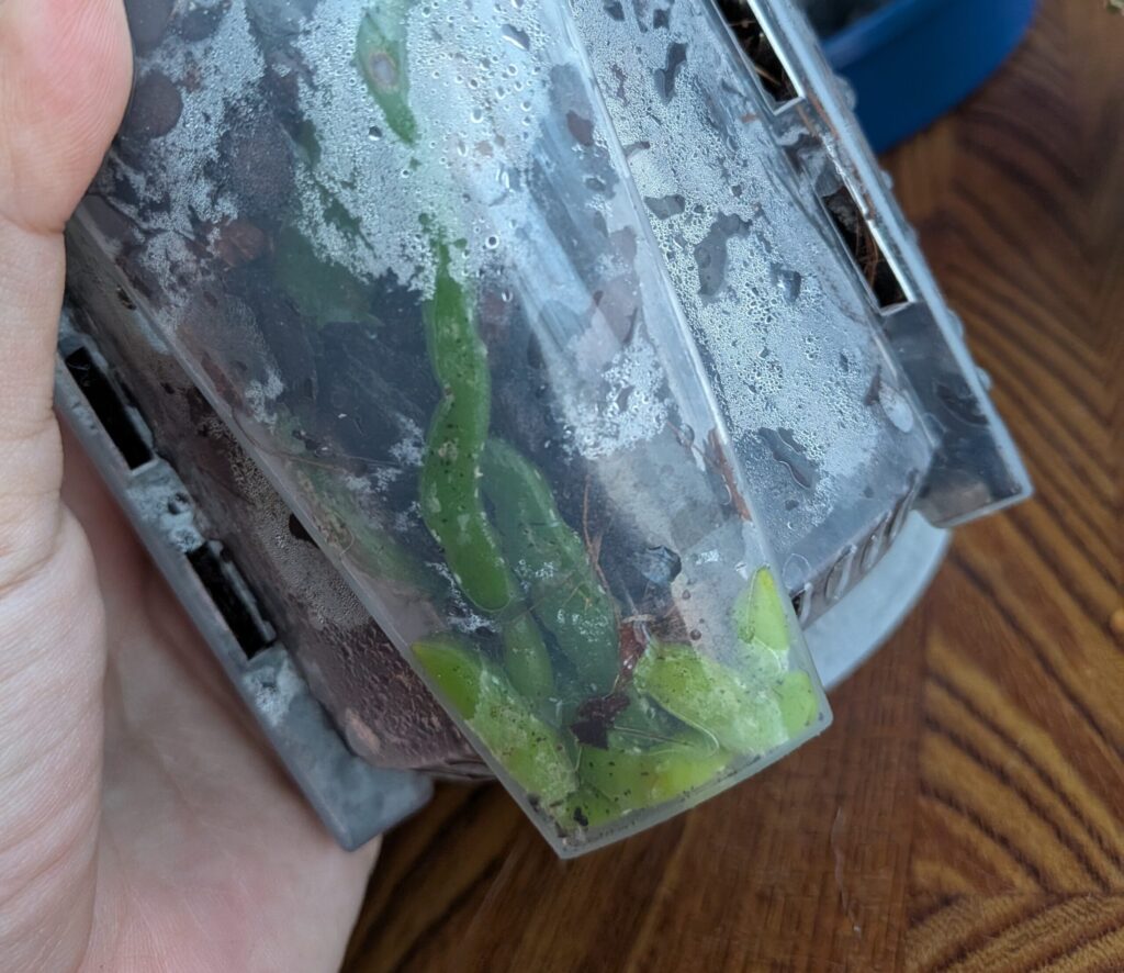透明プラ鉢+バークの組み合わせは、水やりは水苔より多くなりますが、その分「水やりのしすぎで根腐れ」は起こりにくいと思います。