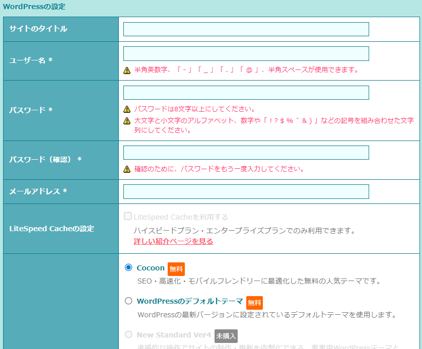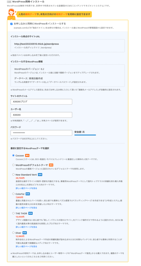 希望のサイトのタイトル、ユーザー名、パスワード、テーマを入力すれば登録完了後すぐにWordPressを始めることが可能です。(後で変更可能です)