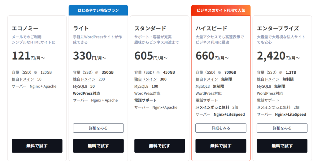 WordPressを始める場合はライトプラン以上を選びましょう。