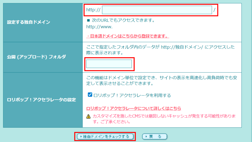 「設定する独自ドメイン」の欄には登録した独自ドメインを入力します。