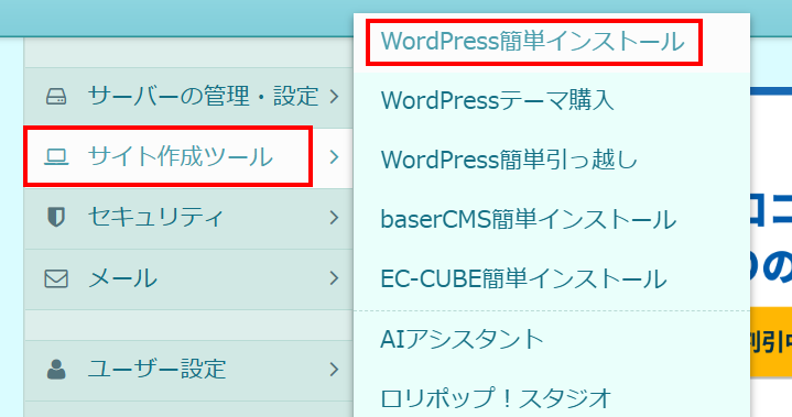 ロリポップの管理画面から「サイト作成ツール」-「WordPress簡単インストール」を選択します。