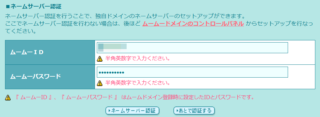 ムームーIDとパスワードを入力し「ネームサーバー認証」をクリック、次のページで「設定」を選択すれば、ロリポップと独自ドメインが簡単に紐づけ完了しました。