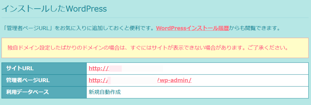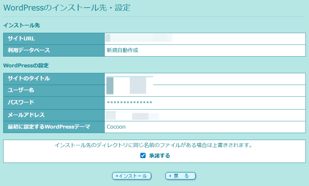 確認画面が表示されるので設定した内容を確認し、間違いなければ「インストール」をクリックすればWordPressの登録が完了です!