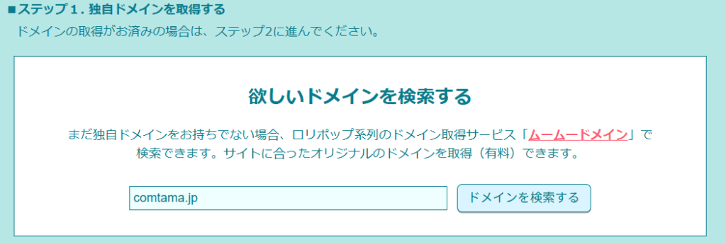 まだ独自ドメインを用意していない場合はここから「ムームードメイン」で登録できます。