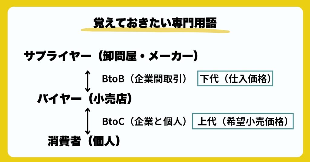 仕入れ先の探し方をご紹介する前に、仕入れの時に使う専門用語を解説します。