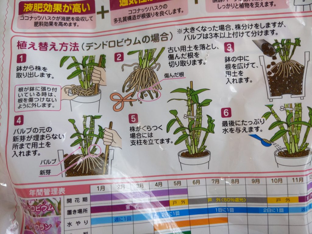花ごころさんのバーク、裏面にデンドロビウムの植え替え方法が書いてくれています!