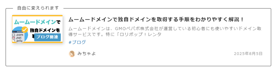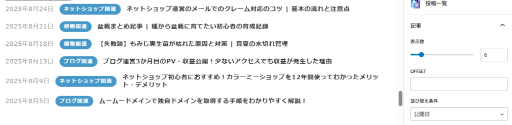 私の場合、記事のタイトルが長いからか日付とカテゴリの表示をオフにしておかないと表示が崩れましたのでご注意ください。(2025/08/27時点)