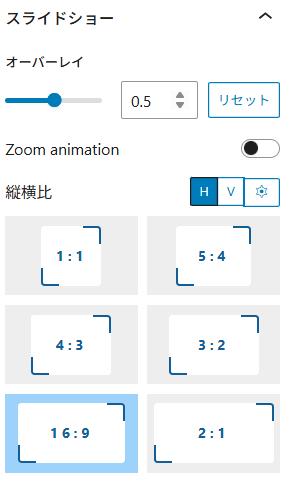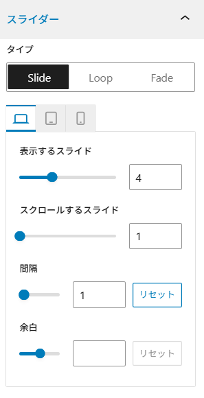 画像同士の間隔やスクロールのスピード、フーカス(中央のスライドを目立たせるかどうか)を選ぶことができます。