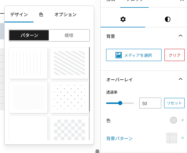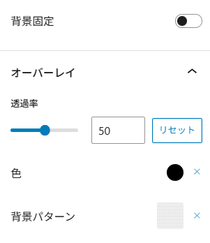 オーバーレイの項目で「透過率」「色」「背景パターン」を変更すれば、同じ写真素材でも様々な雰囲気のコンテナ―を作成できます。