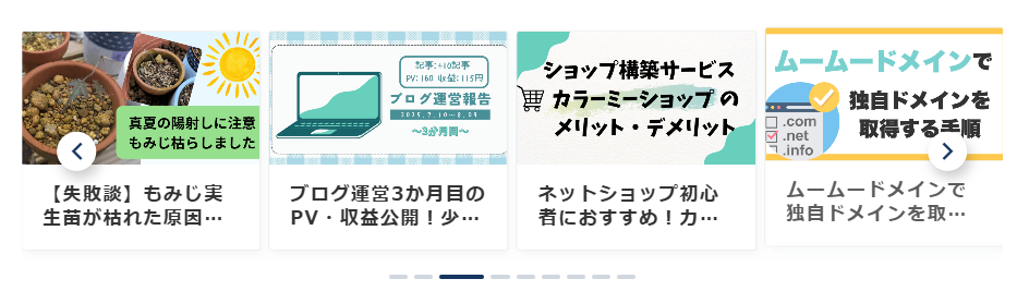 私のブログのトップページにも設置していますが、投稿記事の一覧をスライドショーに出来る機能です。