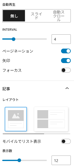 スライドのタイプ、自動再生するかどうか、記事数やレイアウトなども簡単に変更できます。